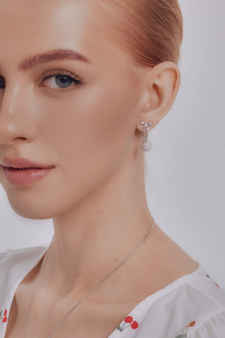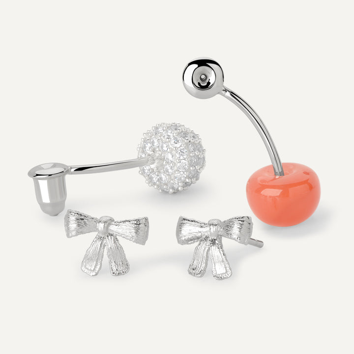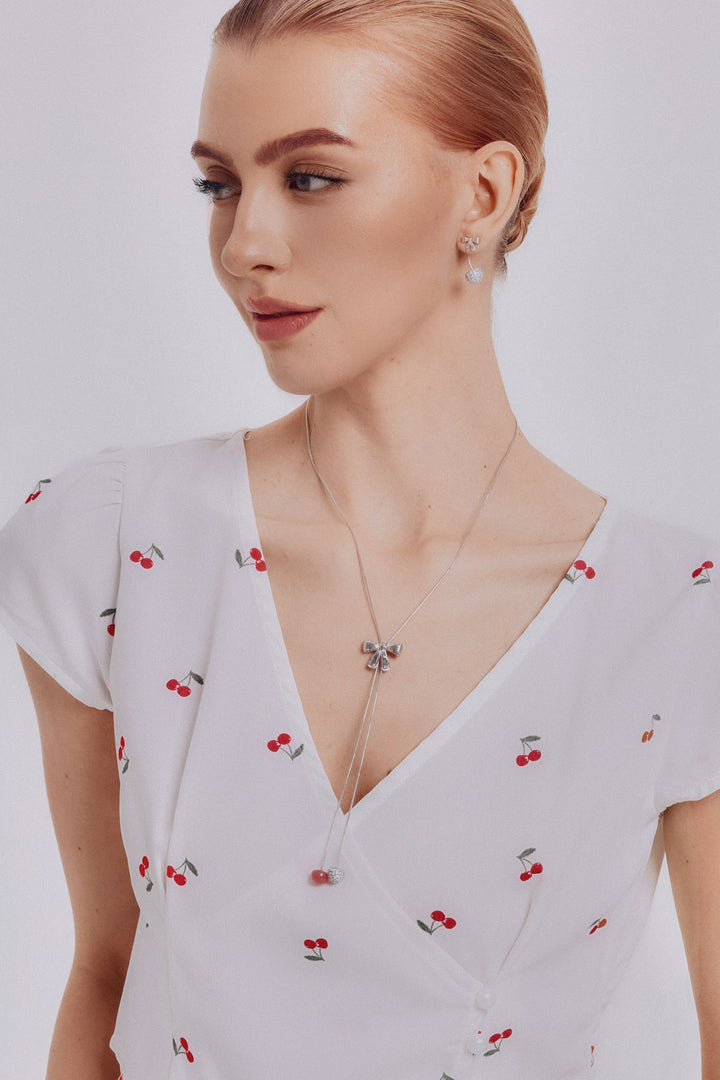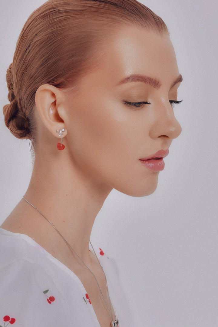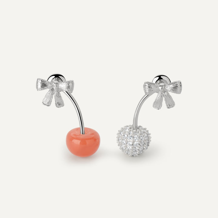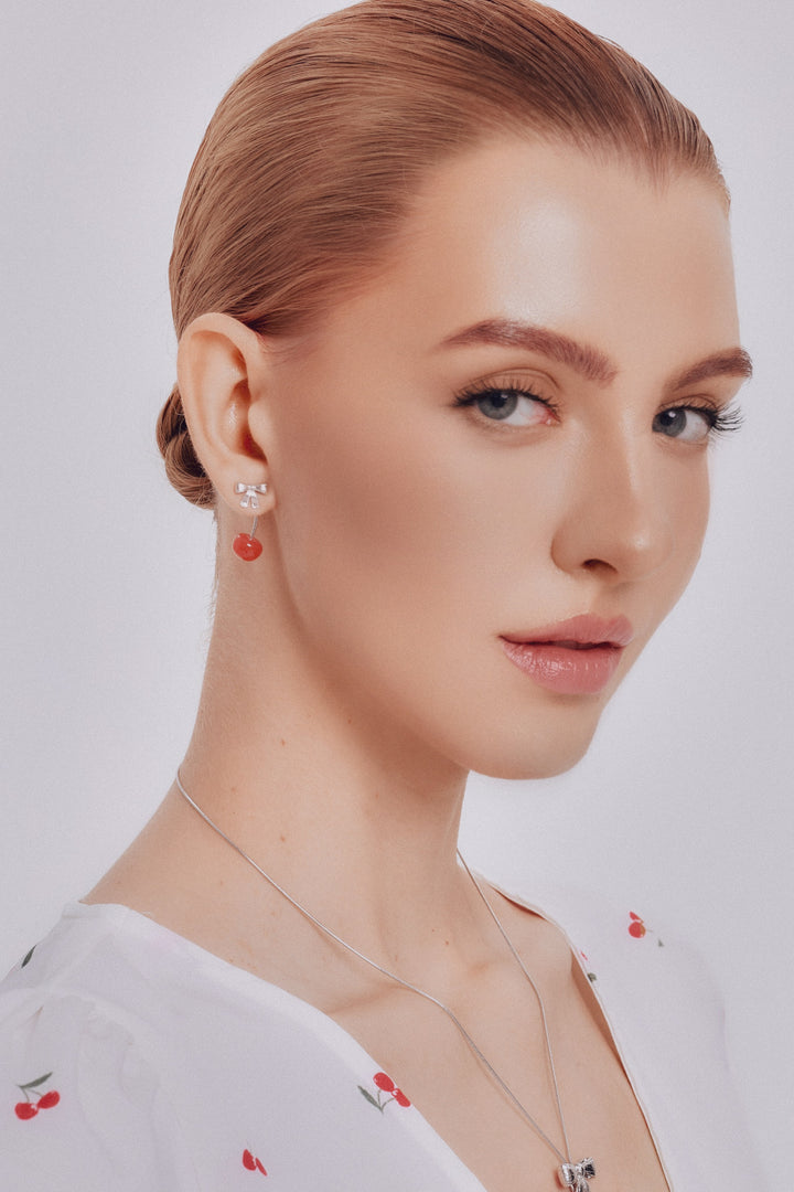 仿絲緞蝴蝶結可以單戴,也可以搭配撞色不對稱櫻桃設計