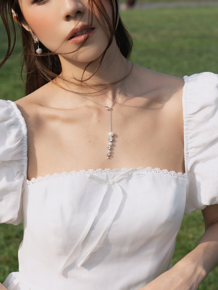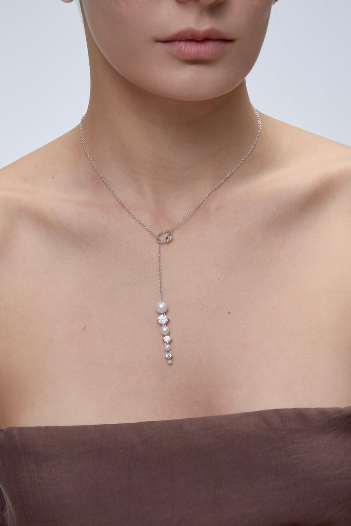 向下延展出由淡水珍珠與鋯石交織構成的蛇尾輪廓。