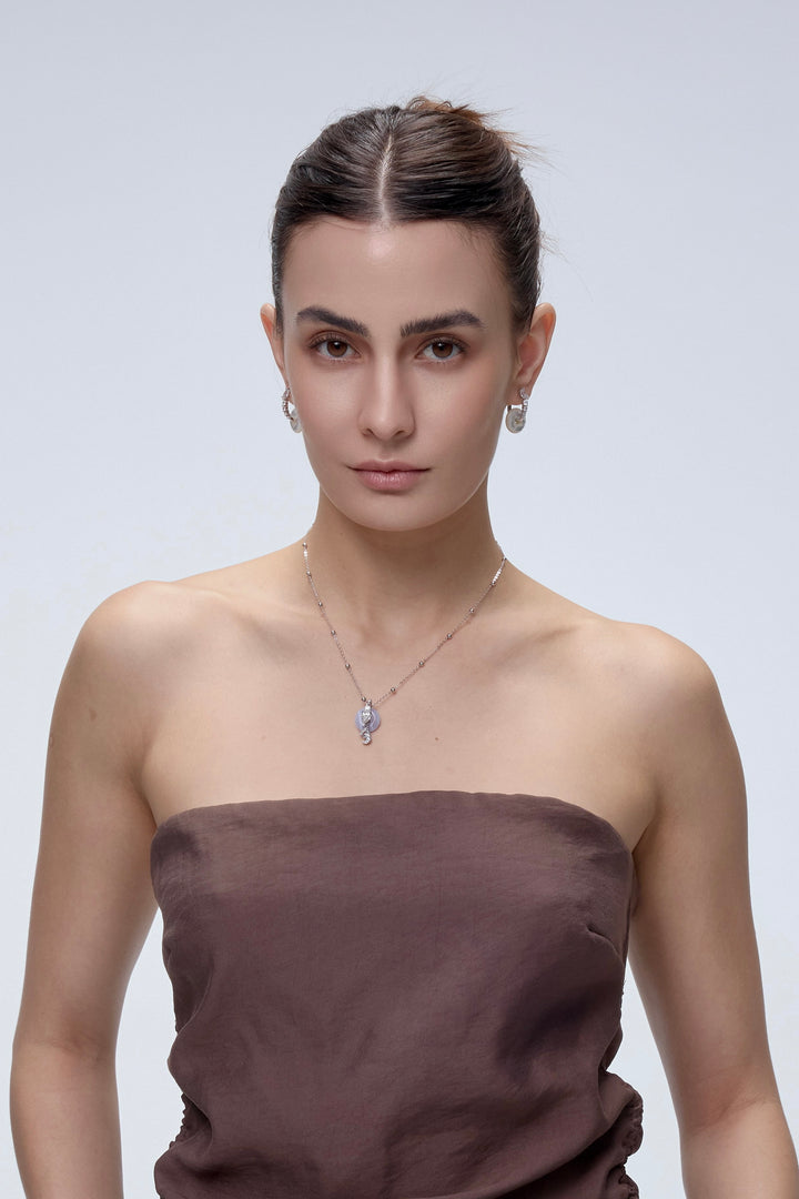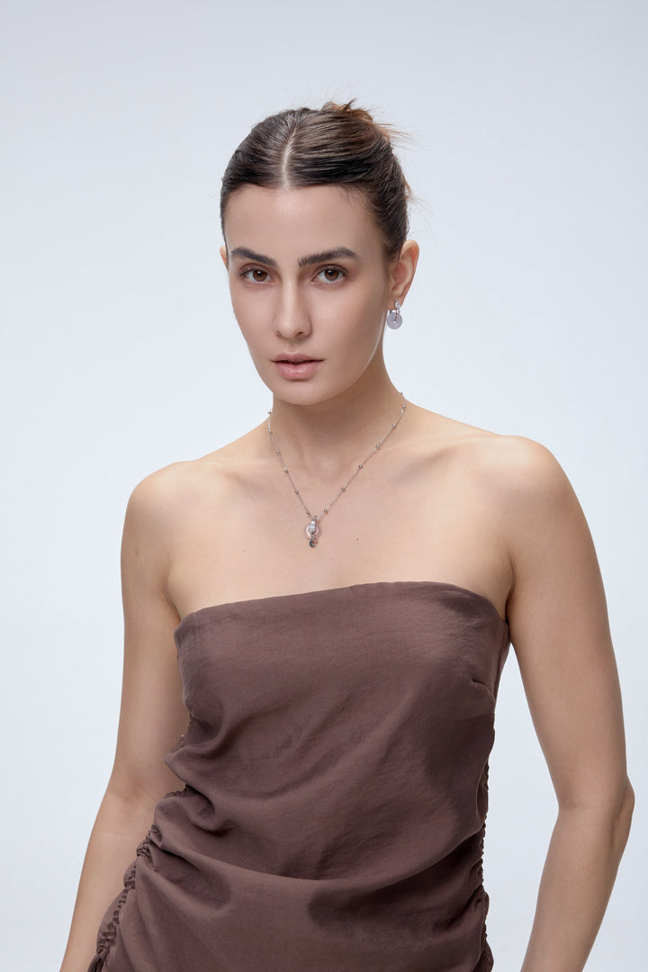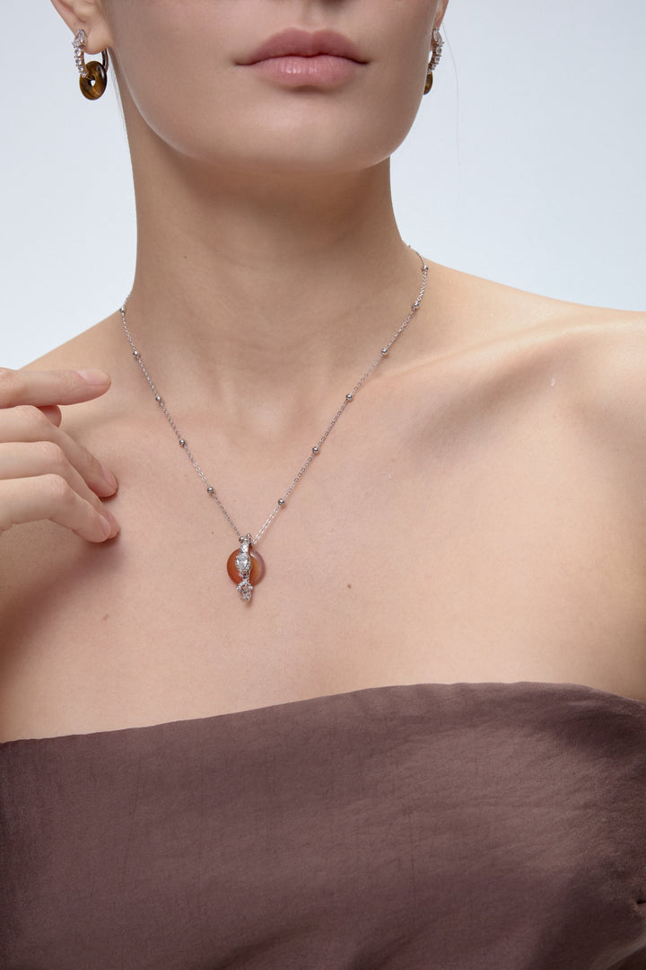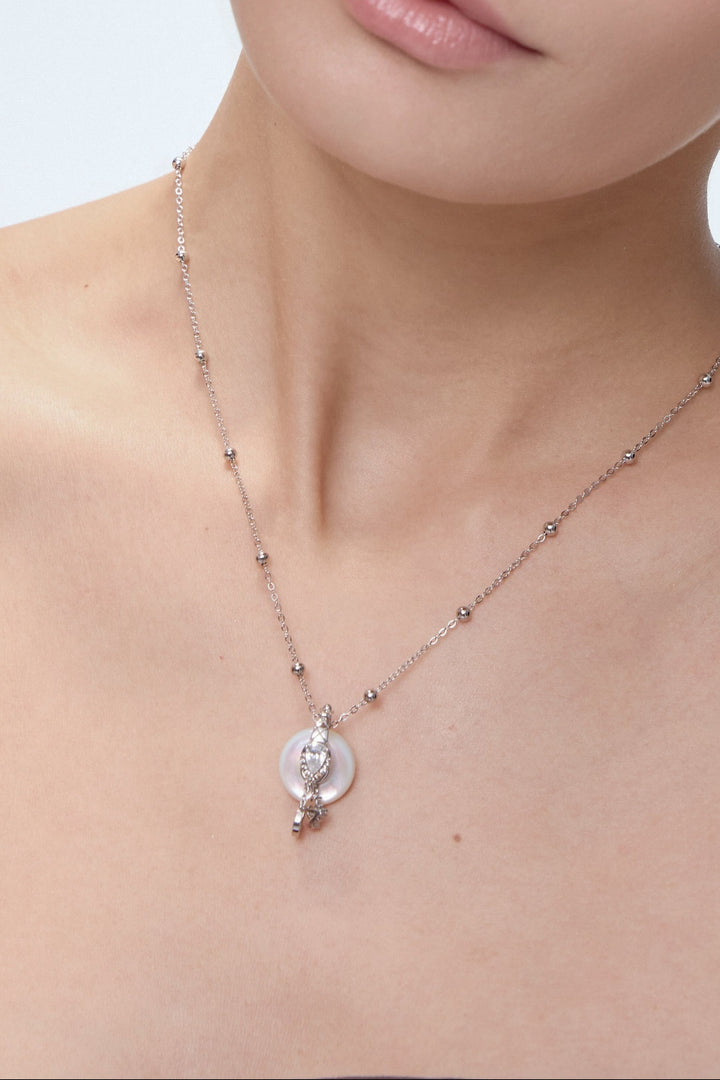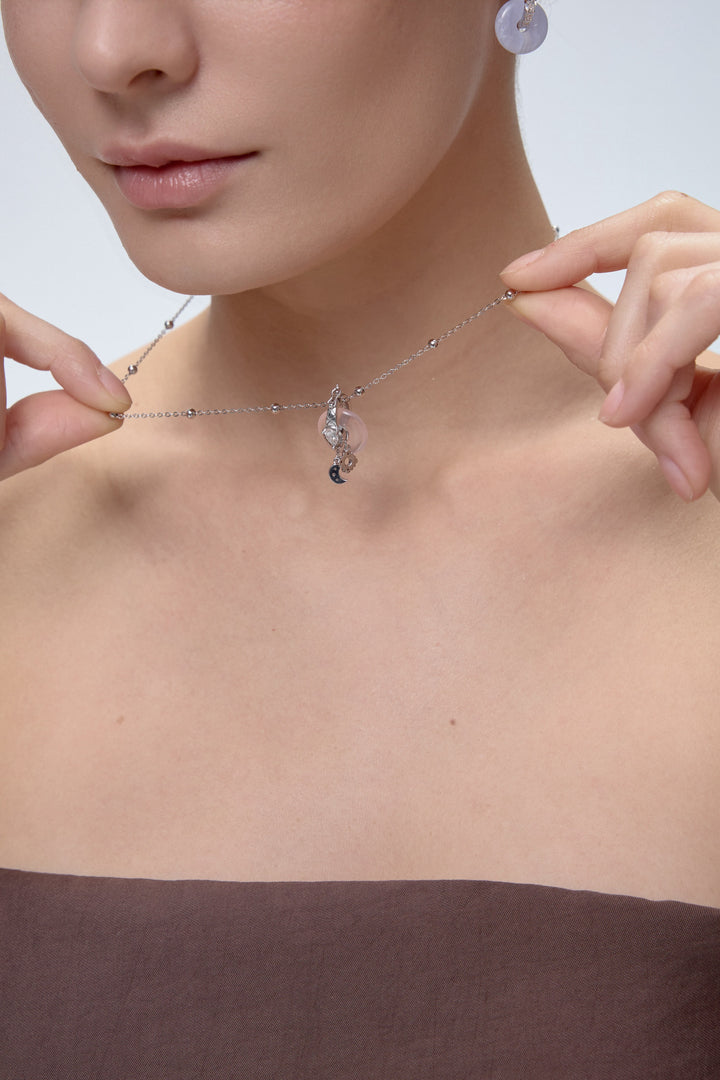 以銜尾蛇環形打造吊墜主體,搭配日月小吊墜,象徵光明與陰影的能量整合。可搭配自選的天然水晶,依據七大脈輪主題與當日直覺,選擇最適合你的能量守護。